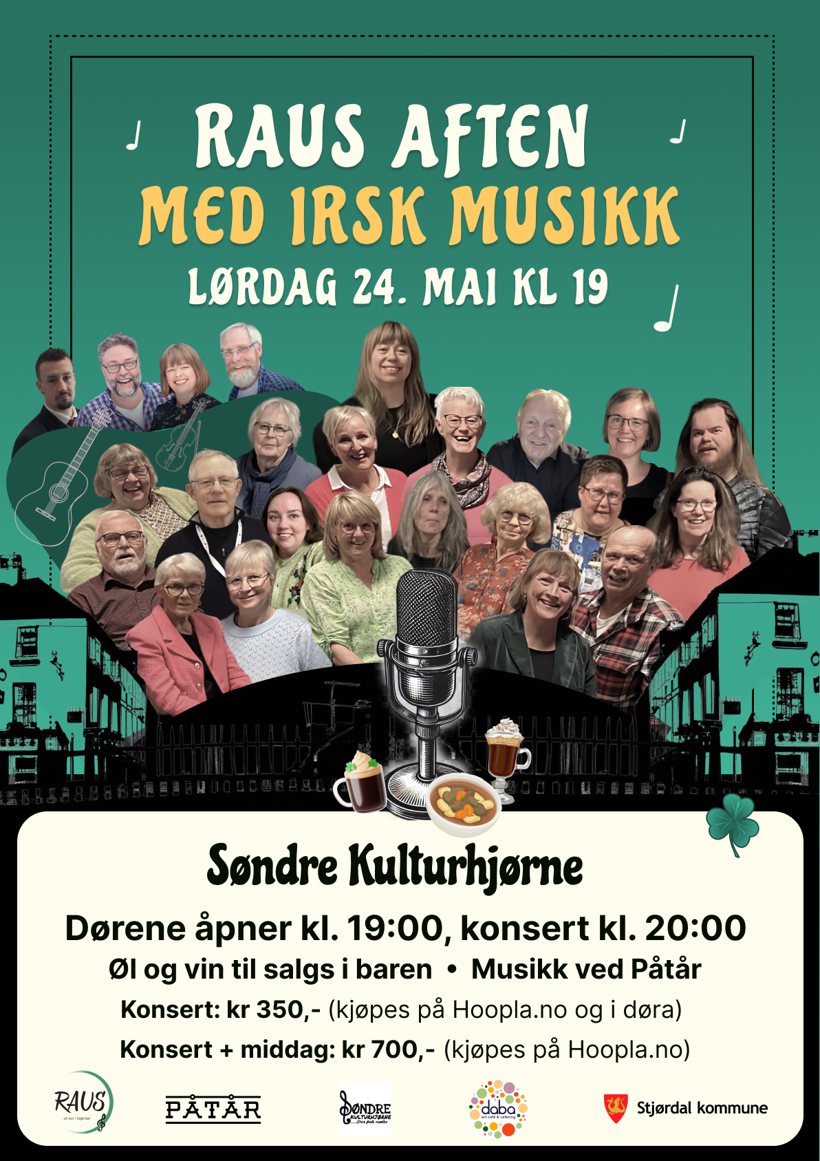 RAUS inviterer til en aften med irsk musikk på Søndre Kulturhjørne lørdag 24.05.25 kl 19. Med oss har vi fått med bandet Påtår som også vil fortsette med konsert etter at selve korkonserten er avsluttet.